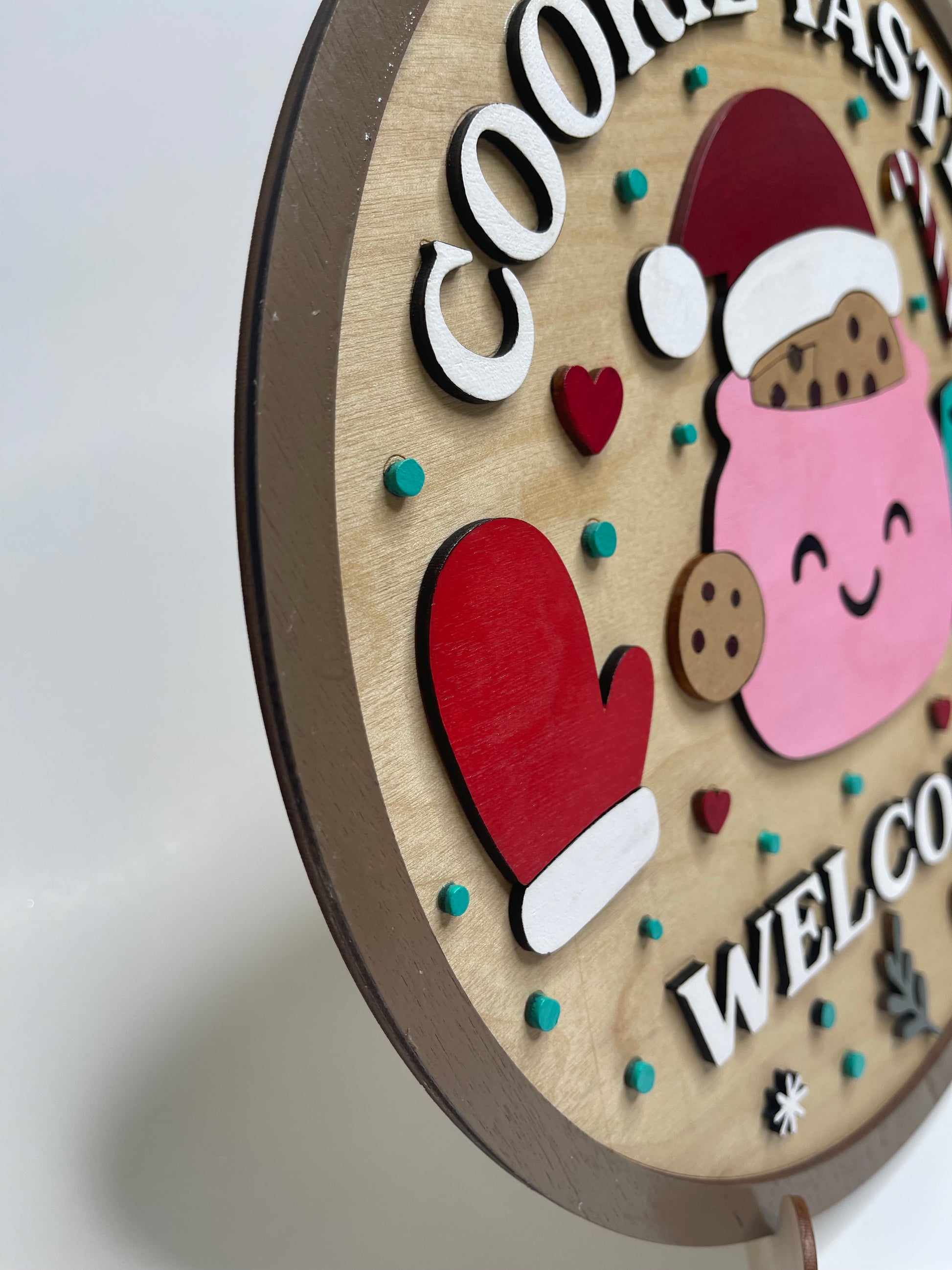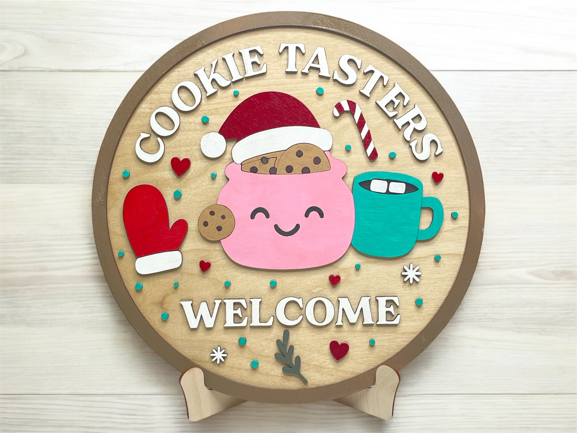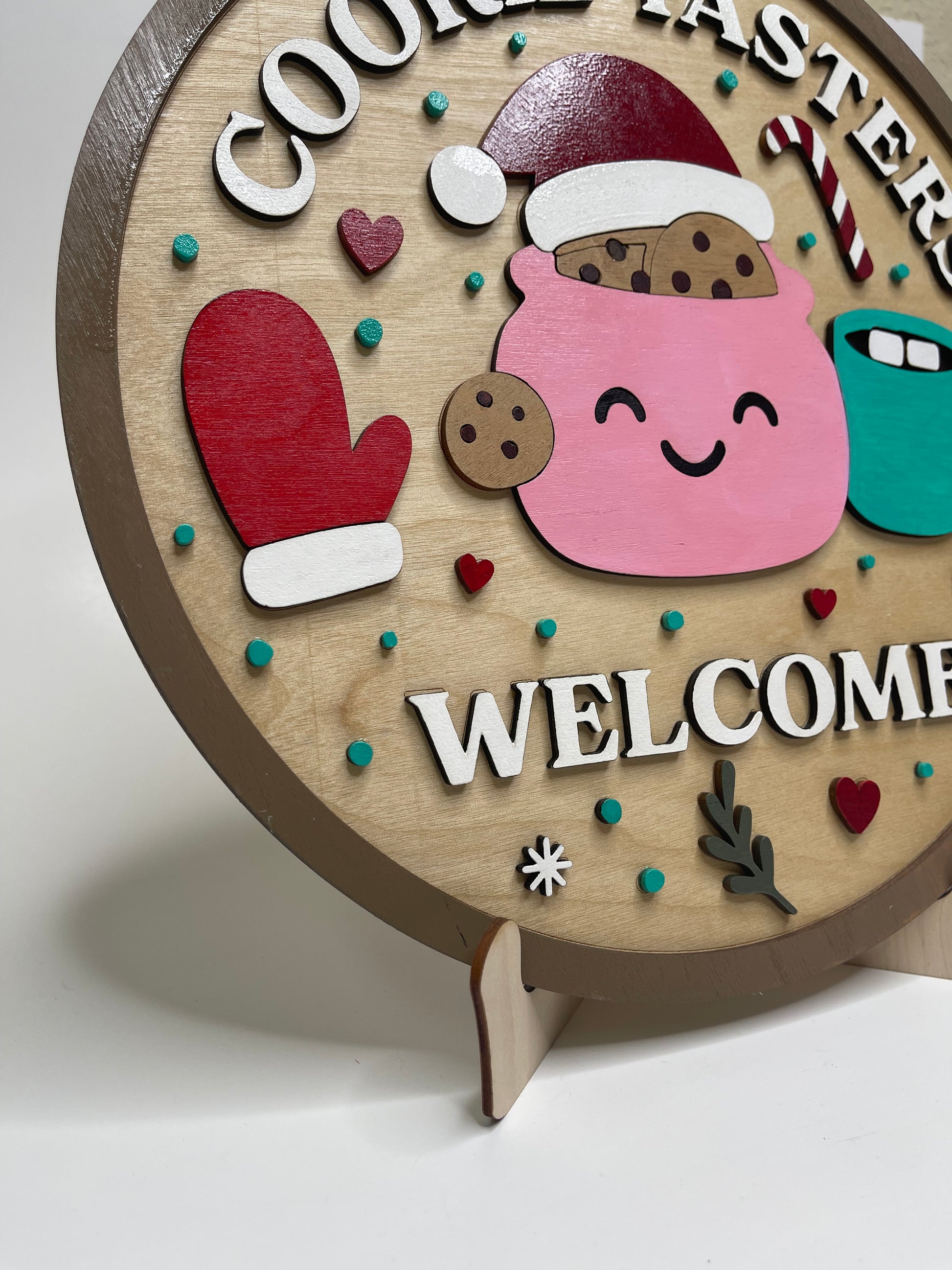 Make your home extra sweet this holiday season with our “Cookie Tasters Welcome” Christmas sign! This whimsical round sign features a cheerful pink cookie jar, Santa hat, candy cane, cocoa mug, mitten, and festive 3D accents—all brought to life with vibrant hand-painted details.
