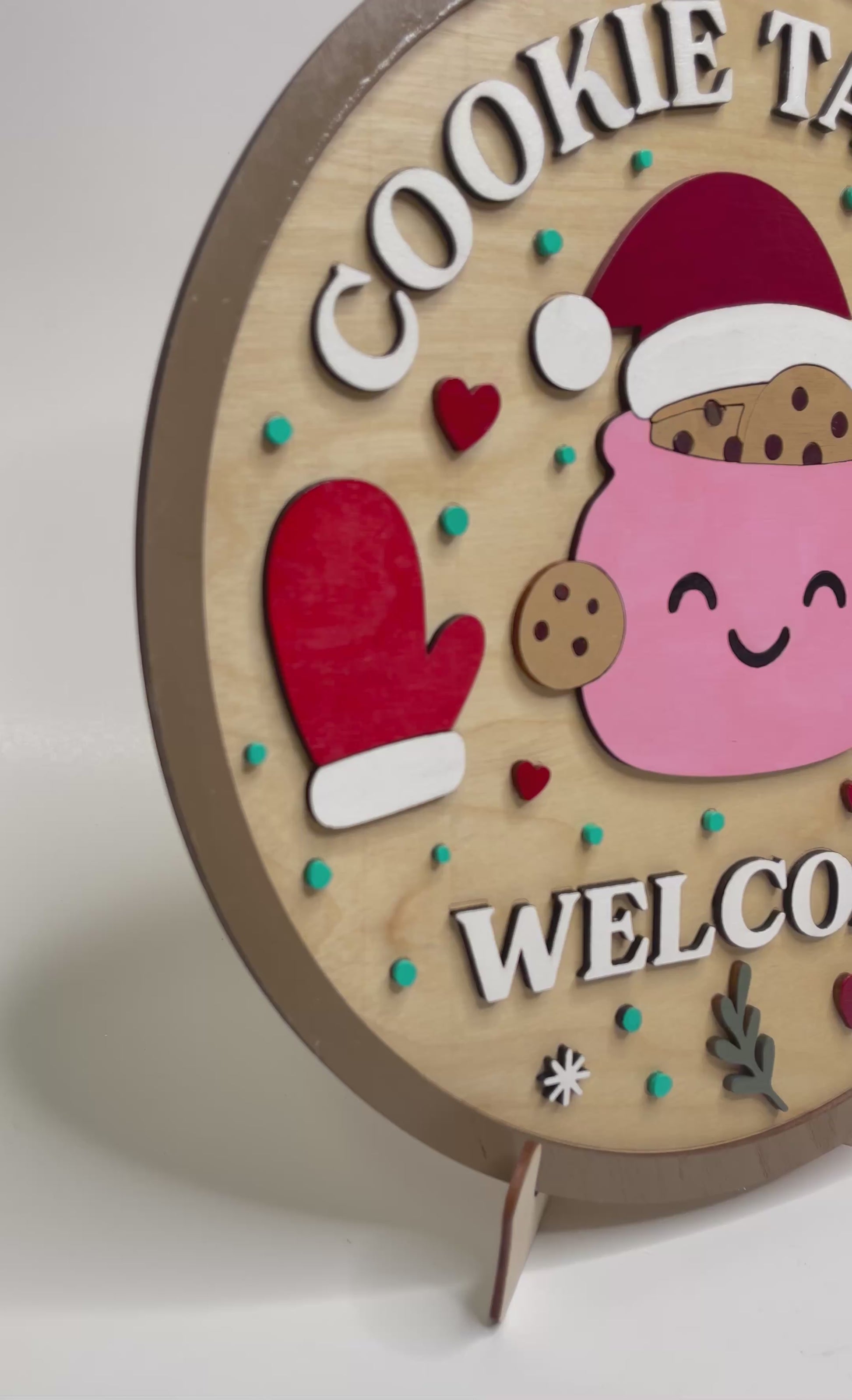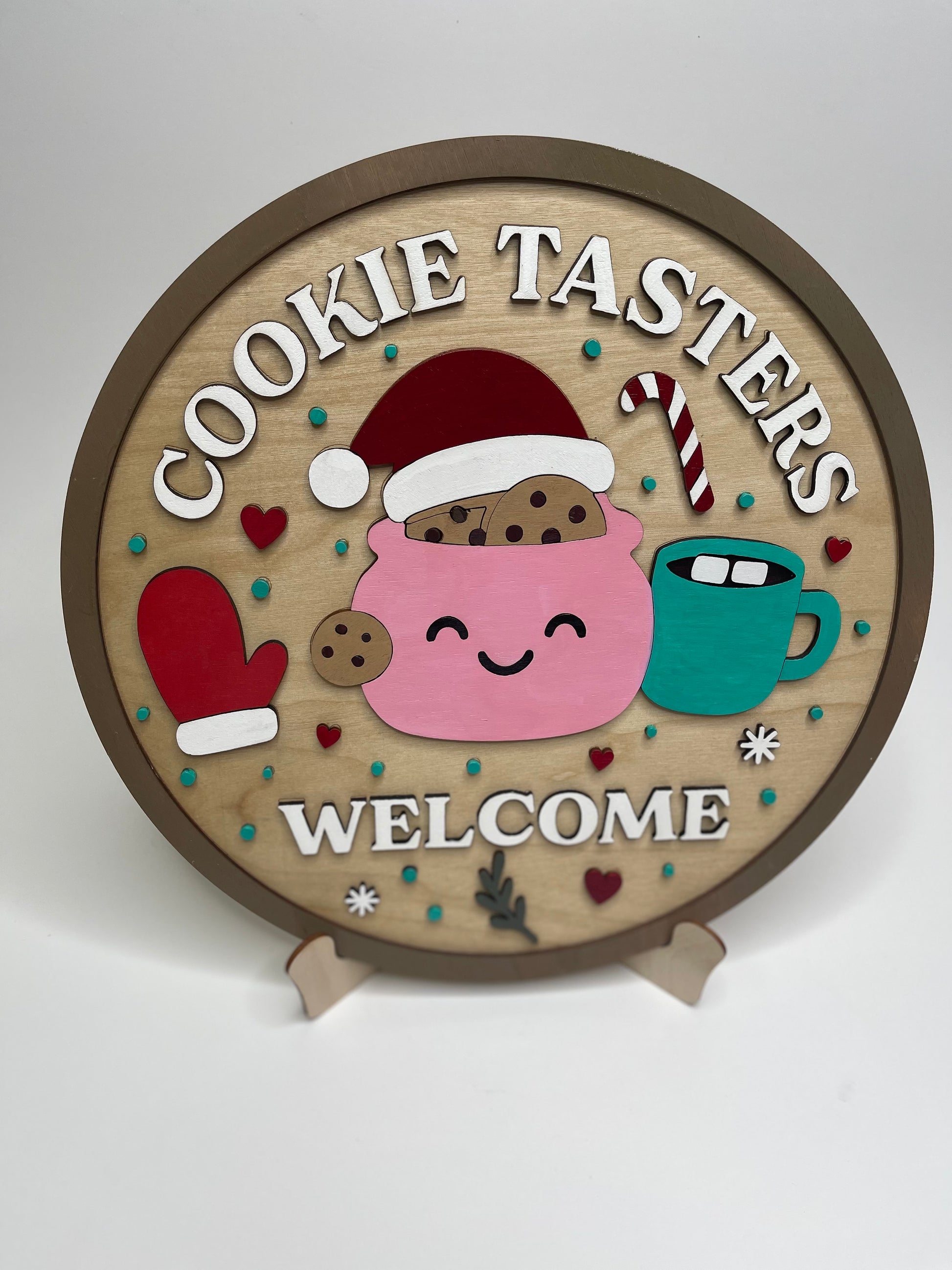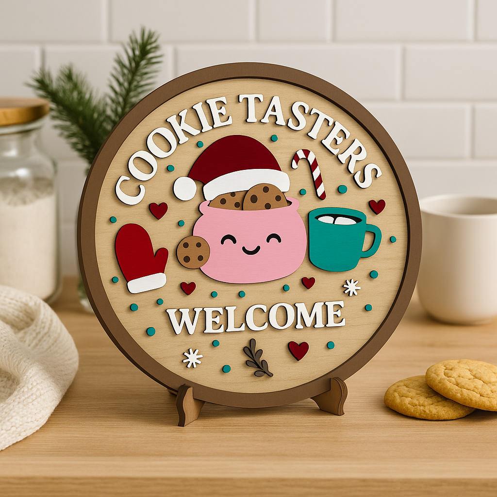 Make your home extra sweet this holiday season with our “Cookie Tasters Welcome” Christmas sign! This whimsical round sign features a cheerful pink cookie jar, Santa hat, candy cane, cocoa mug, mitten, and festive 3D accents—all brought to life with vibrant hand-painted details.