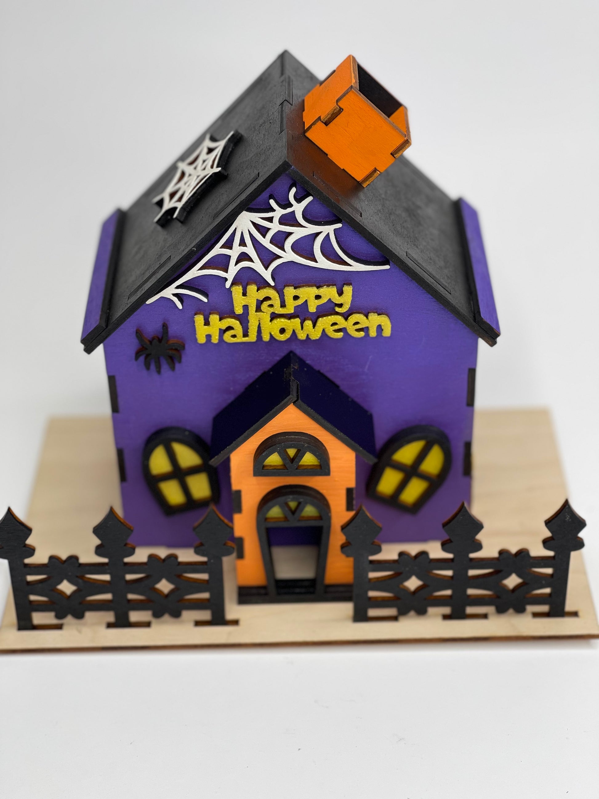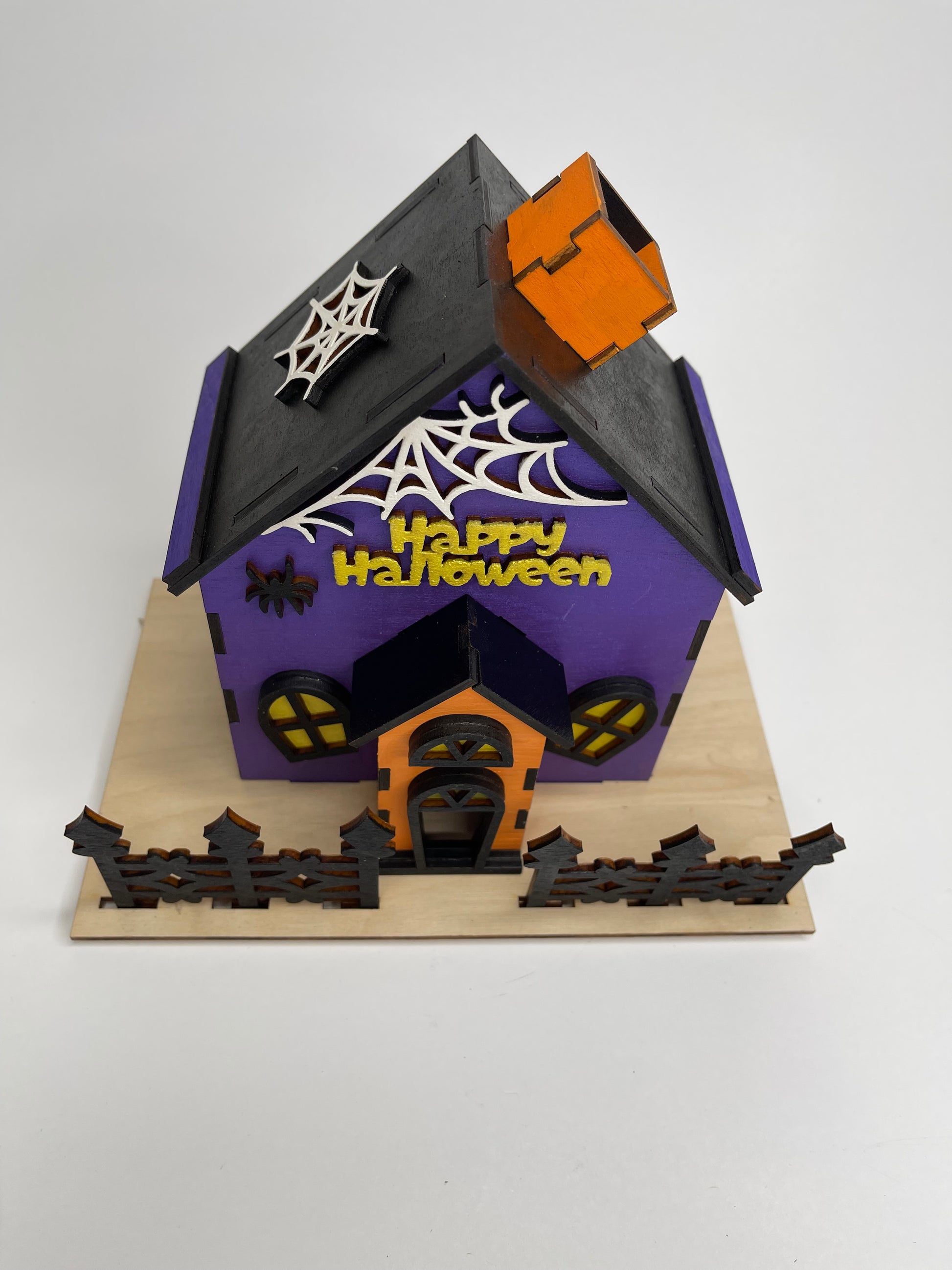 Includes haunted house pieces, fence, and “Happy Halloween” sign