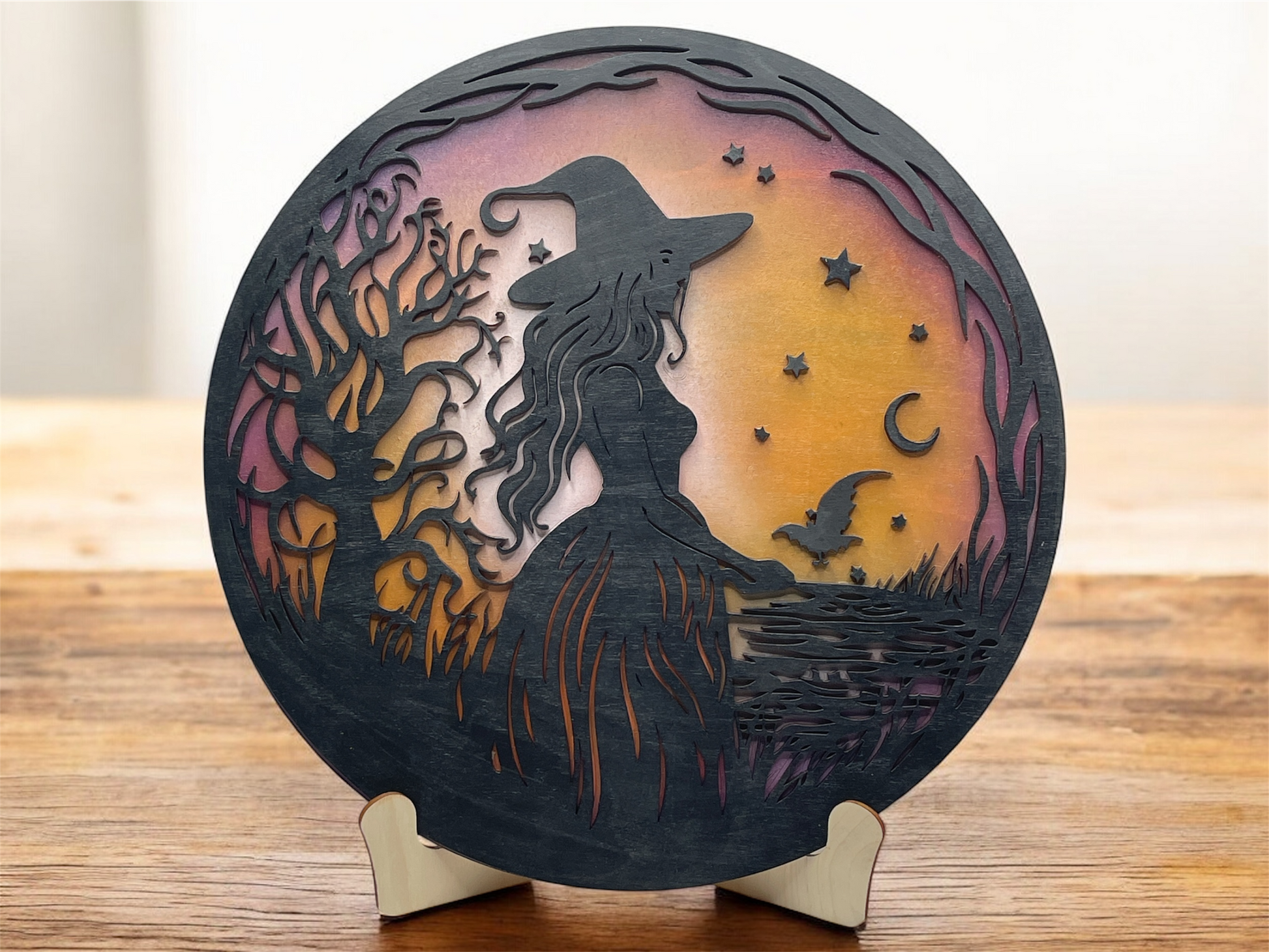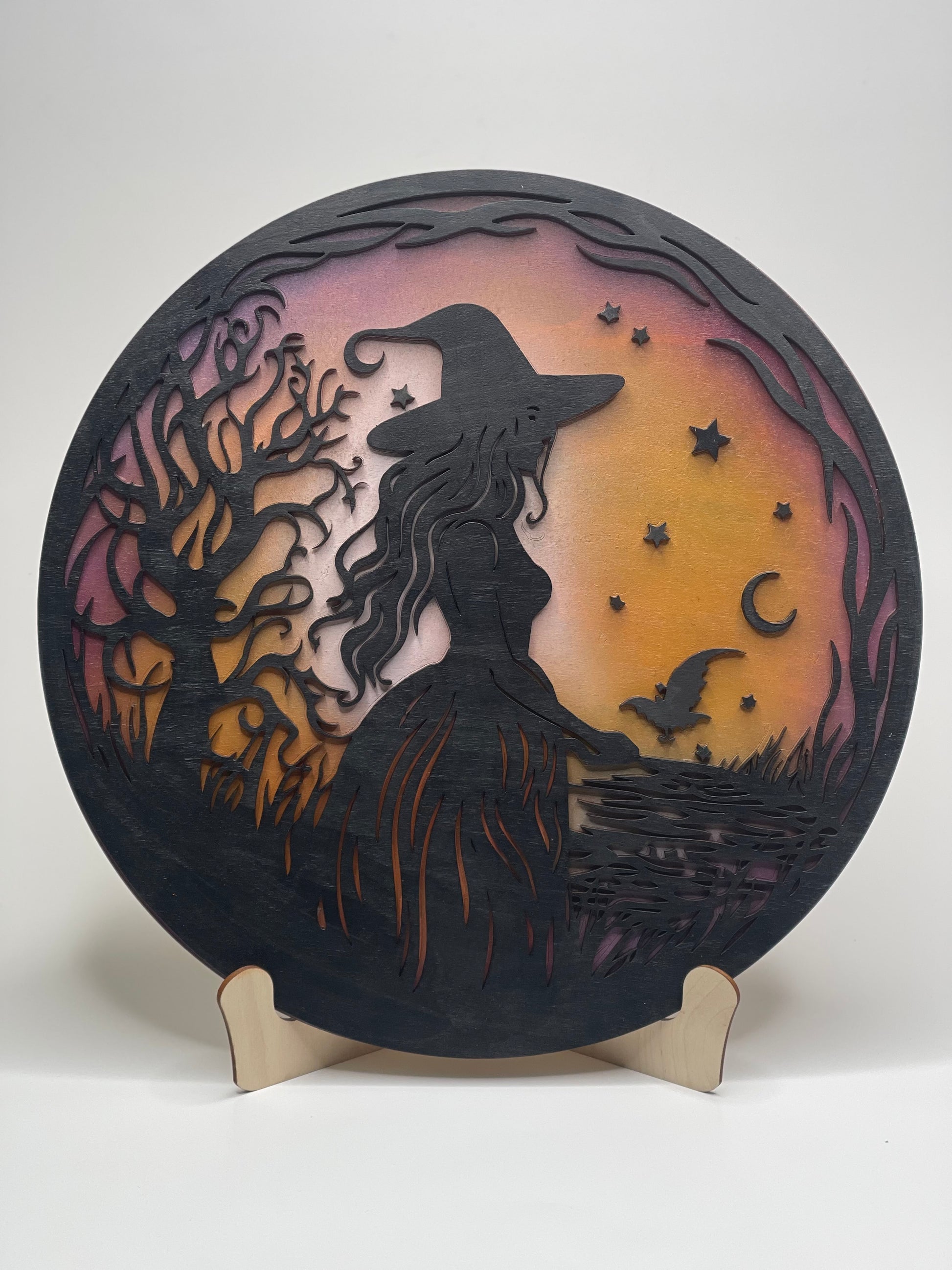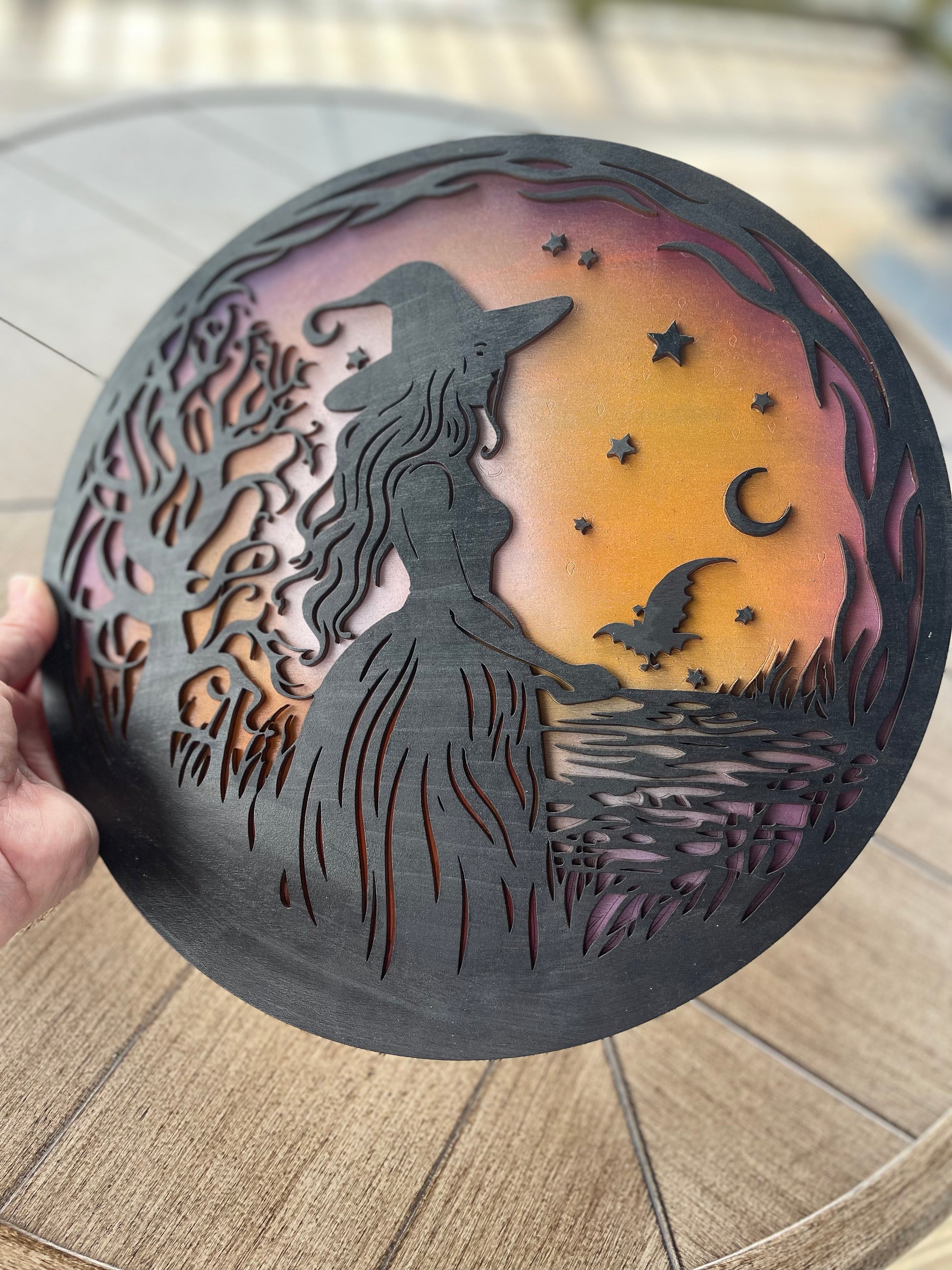 Add a touch of magical charm to your space with this handcrafted witch home decor sign! Measuring 11.6” x 11.6”, this sign features one intricately laser-cut wood layer, placed over a solid airbrushed background for stunning depth and dimension.