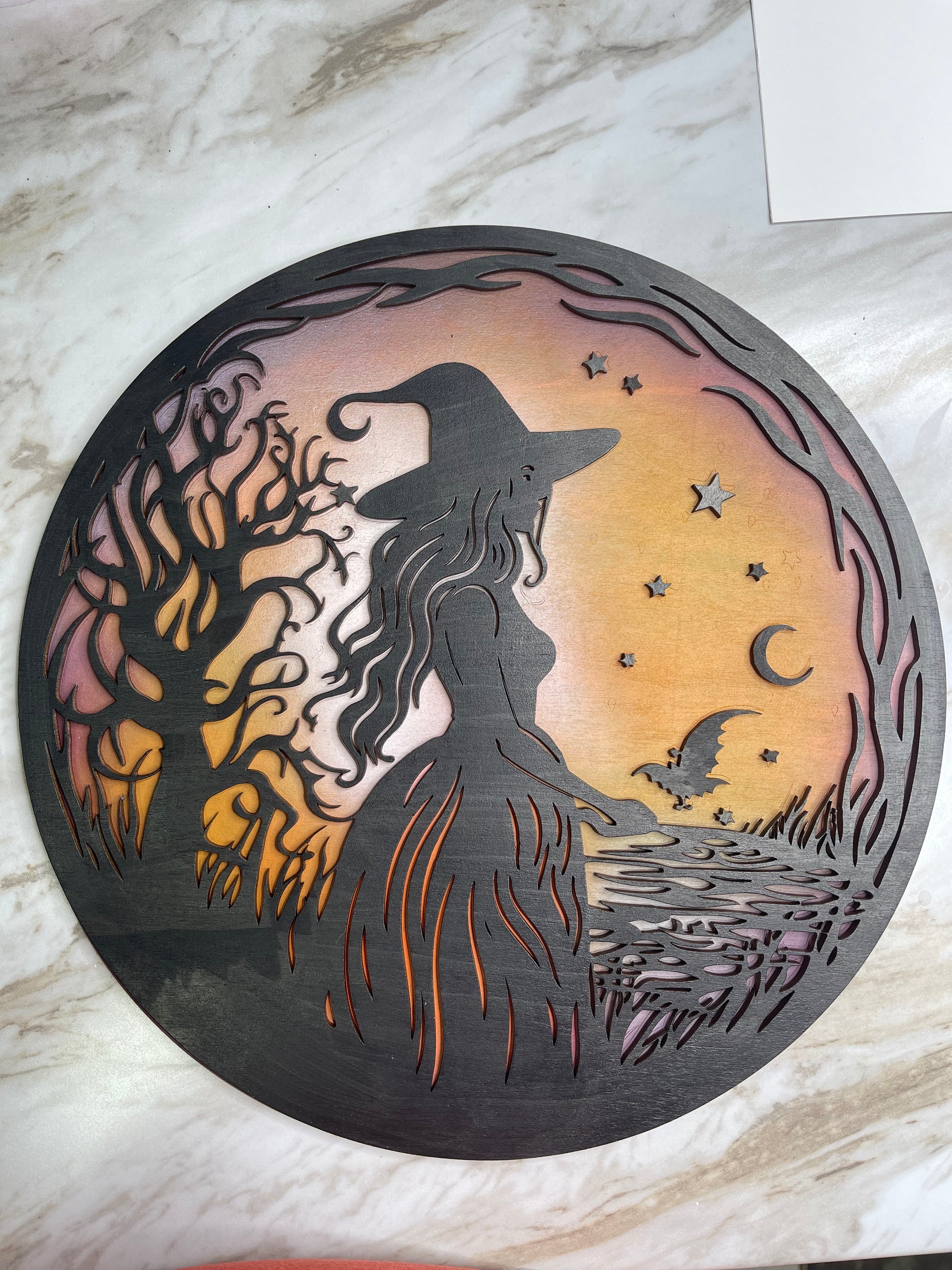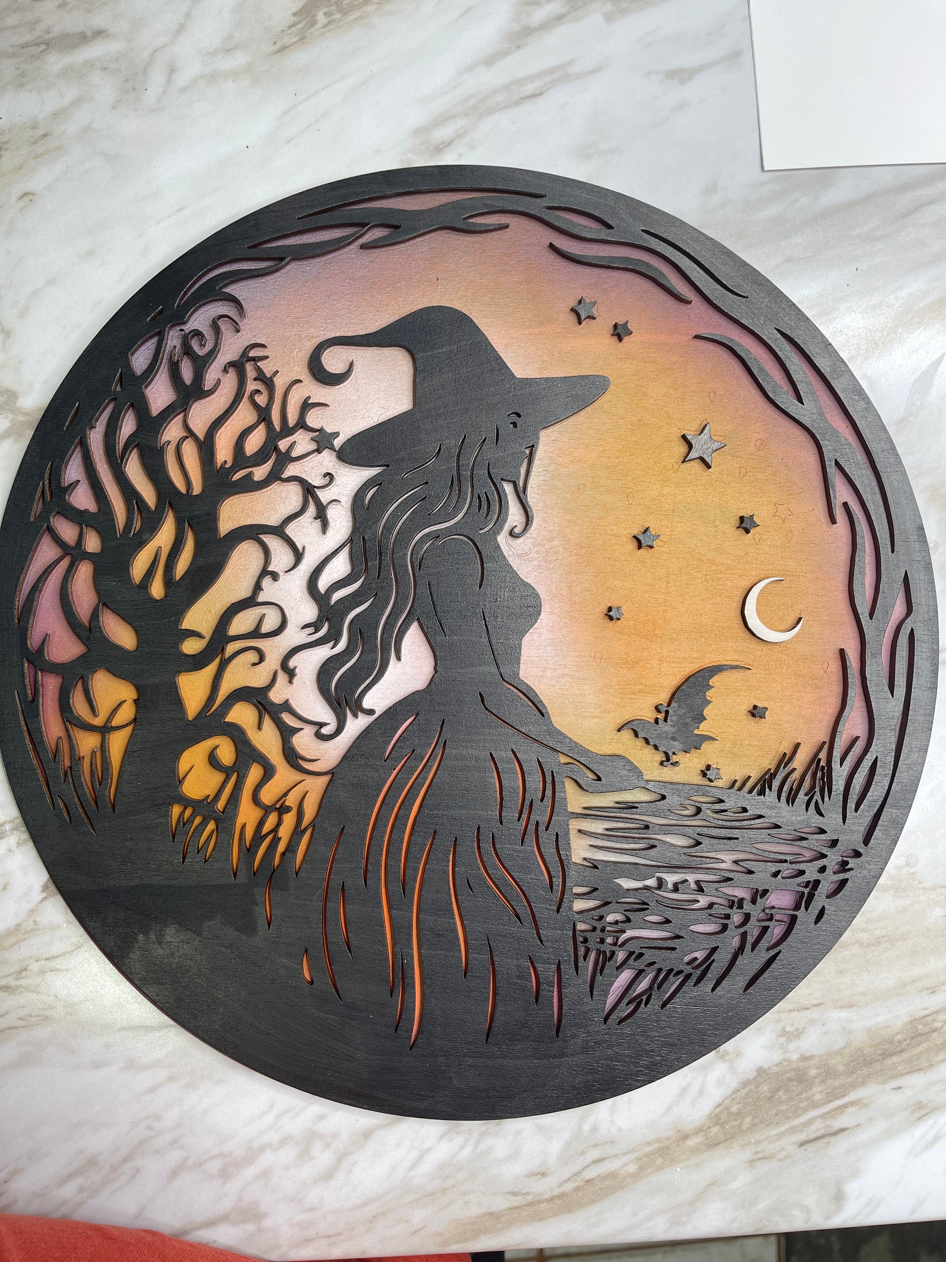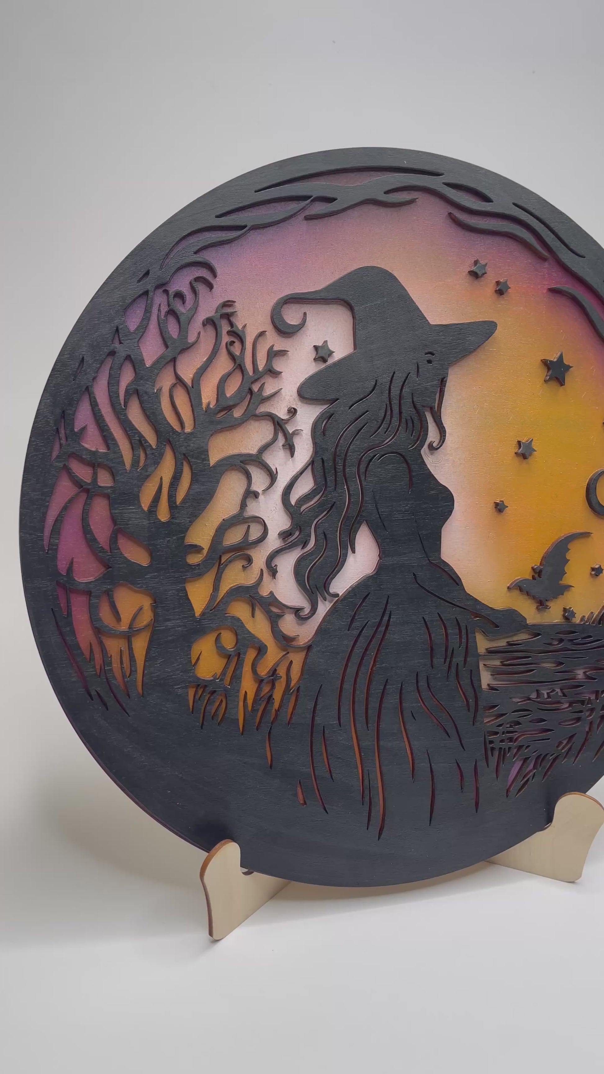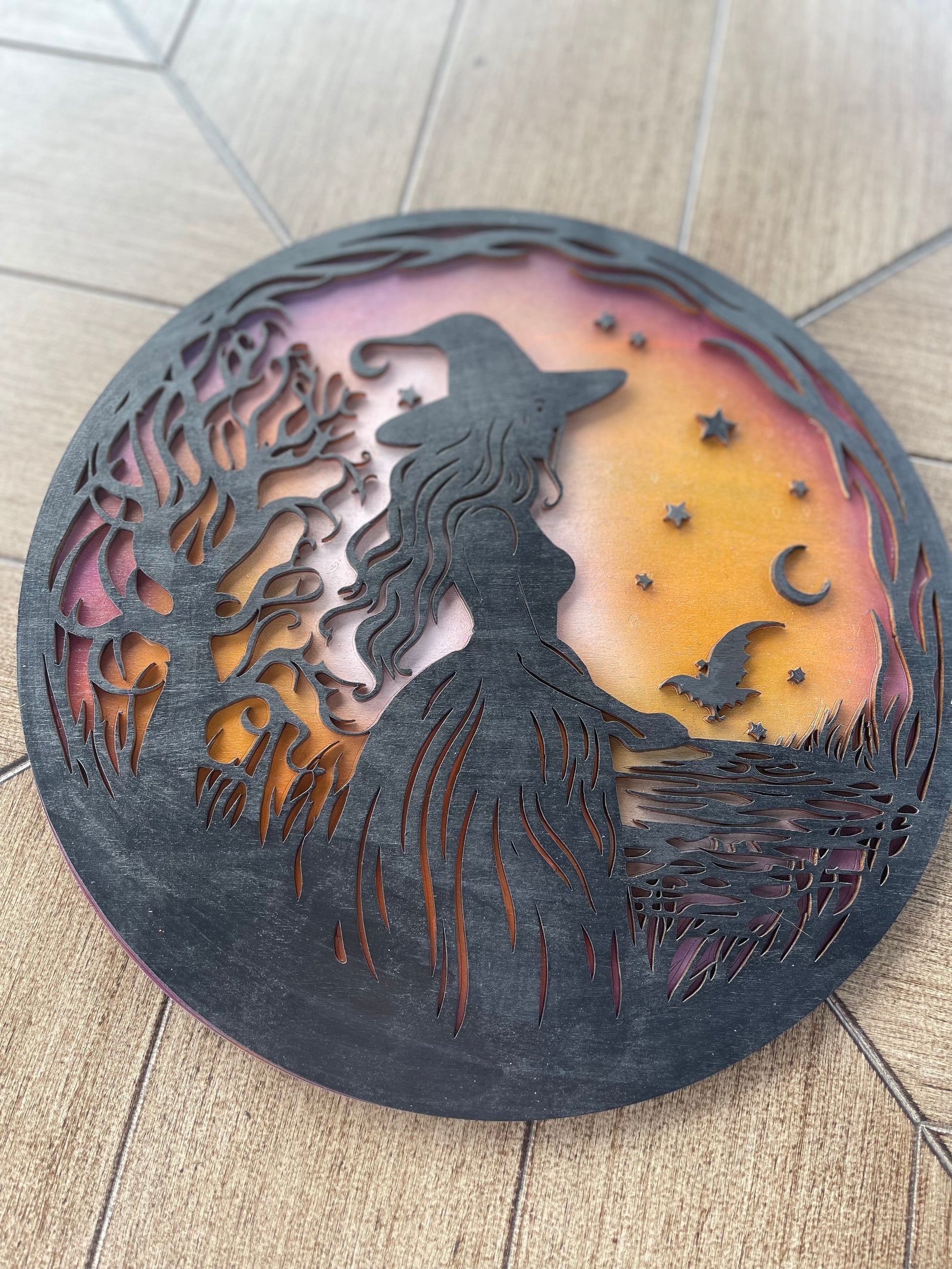 Add a touch of magical charm to your space with this handcrafted witch home decor sign! Measuring 11.6” x 11.6”, this sign features one intricately laser-cut wood layer, placed over a solid airbrushed background for stunning depth and dimension.