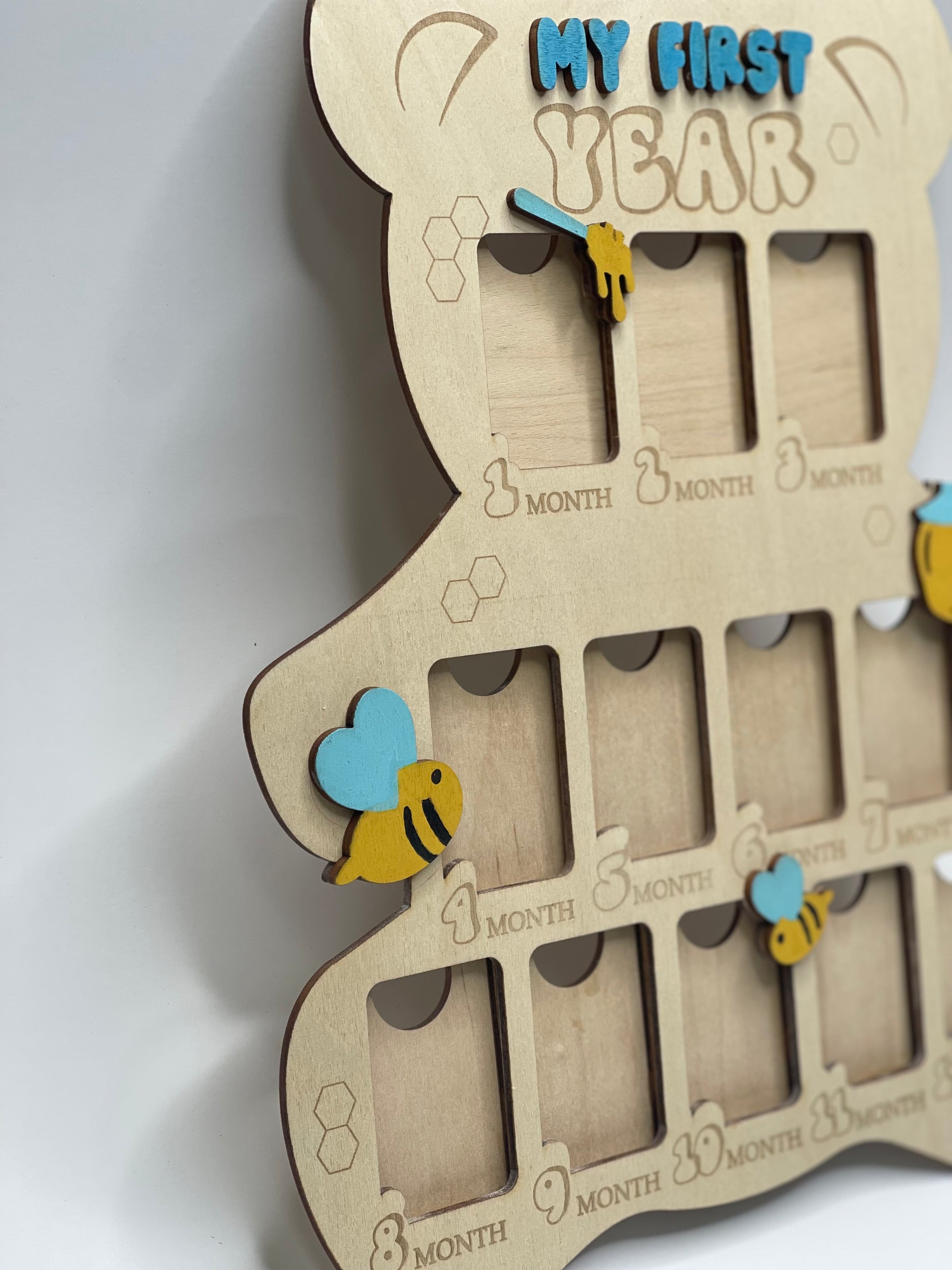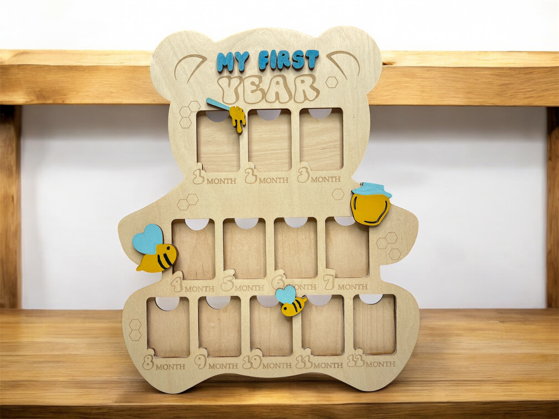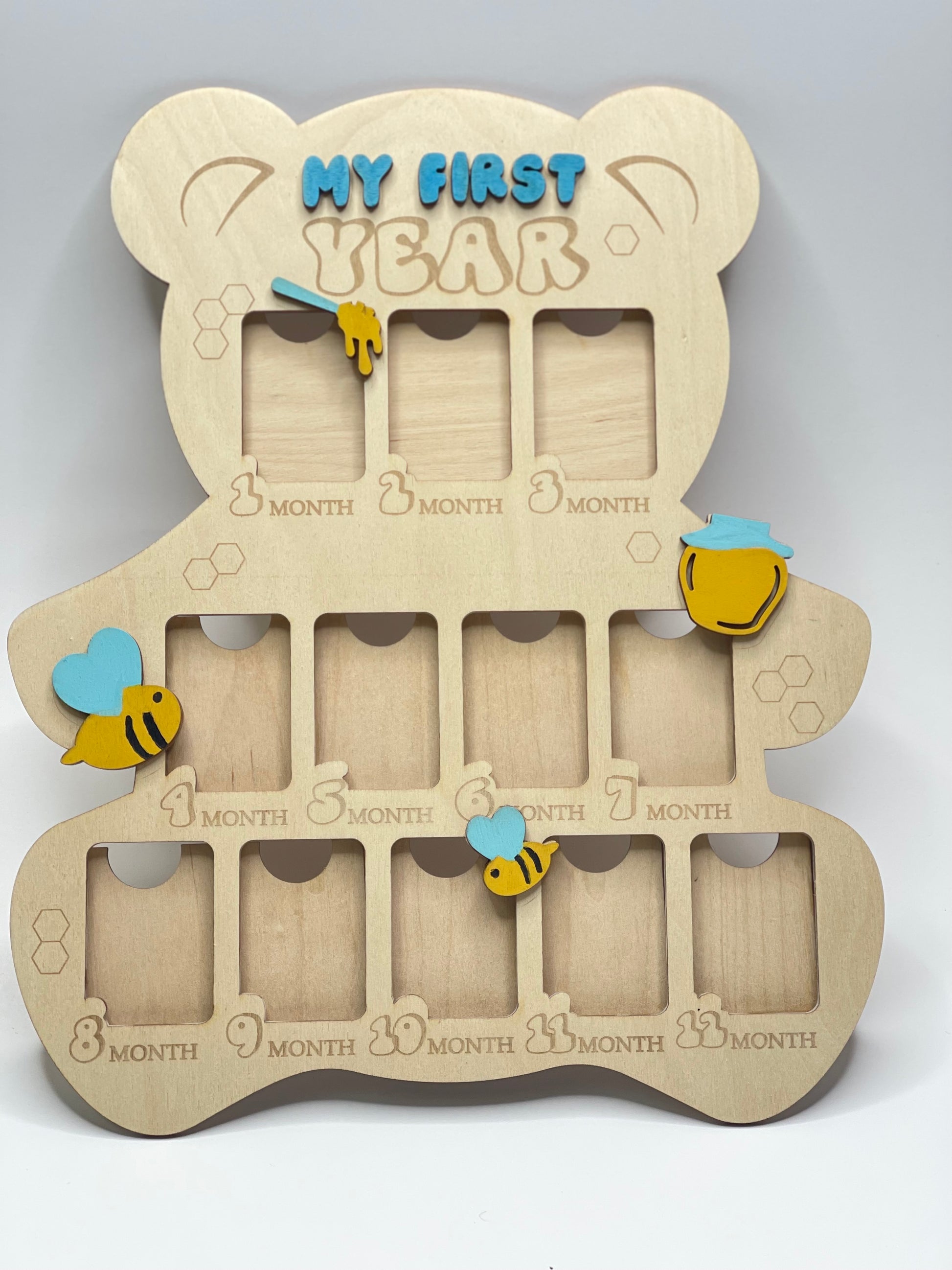 Celebrate every sweet milestone with our personalized "My First Year" Baby Photo Board! Shaped like a teddy bear and designed with adorable bees, hearts, and honey pots, this handcrafted board is a charming way to showcase your baby's monthly growth.