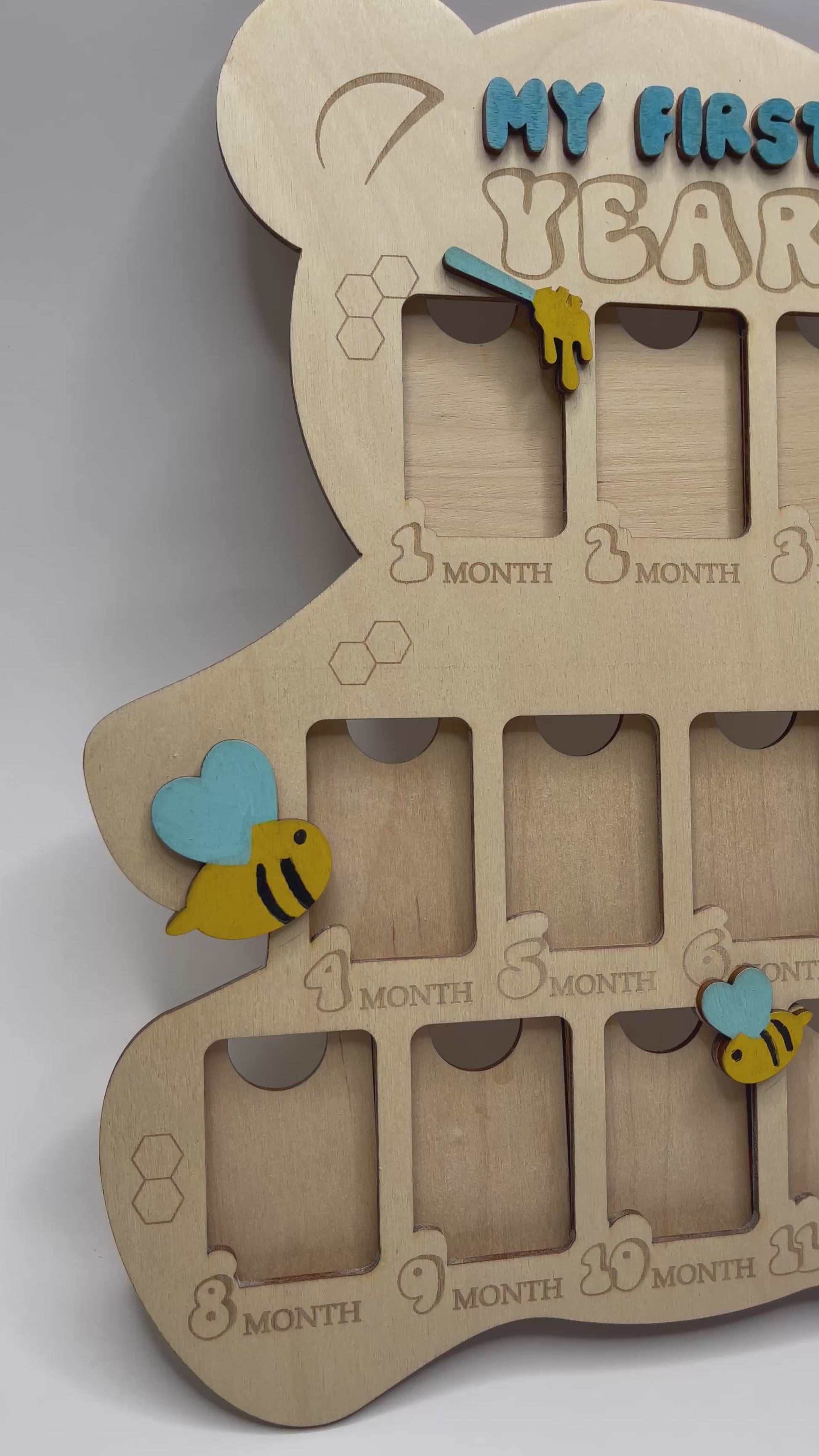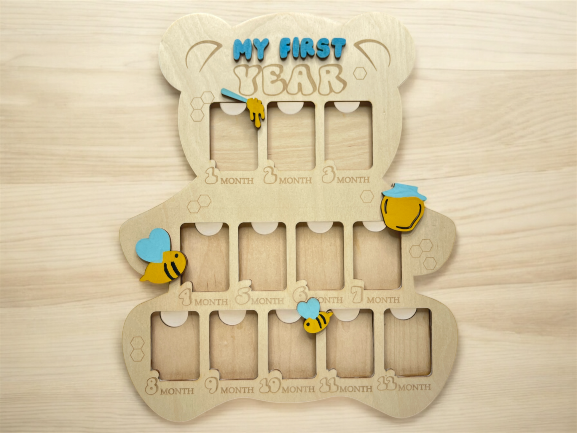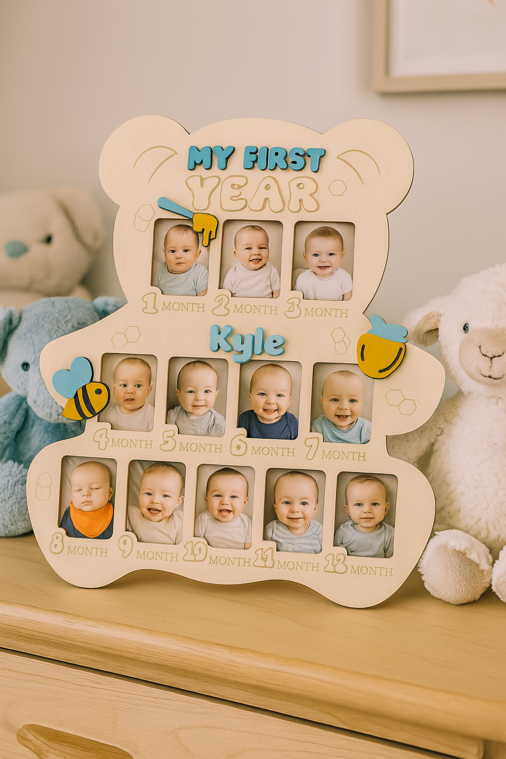 Celebrate every sweet milestone with our personalized "My First Year" Baby Photo Board! Shaped like a teddy bear and designed with adorable bees, hearts, and honey pots, this handcrafted board is a charming way to showcase your baby's monthly growth.